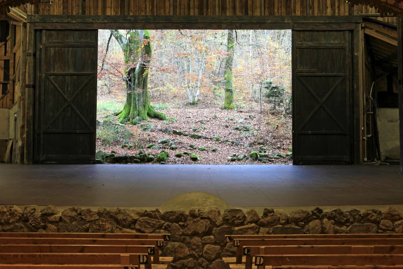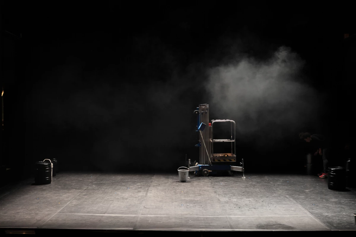 Dans ces oeuvres nous pouvons, enfin, suspendre le geste pour « poser un espace », poser un espace doucement, dans ses contours, ses lignes et ses histoires peuplées de silence et de lenteur. Silence-lenteur-espace comme une même matière suggérait Claude Régy dans L’Ordre des mots. Silence-lenteur-espace comme une ritournelle dansant dans les images de Claire Chevrier. Dans son travail, l’espace arrive par le détail. Ses photographies sculptent ce qui s’oublie et les possibles naissent là, dans ces temps contenus derrière des routes, des scènes, des machines, des barres de béton et sous le vide surtout, celui laissé par le besoin de trop construire. Pour éviter de se cogner, l’humanité a assagi la nature en créant des paysages. Un « pays sage » c’est un lieu nommé et attendu où les choses se placent et se répètent sans surprise. Mais, sous l’oeil de Claire Chevrier, la vision d’un environnement stable se craquèle et remet en cause la place immuable que nous semblons occuper. Les paysages ici se contournent et se manipulent. Il n’y a plus d’espace global mais une multitude d’éléments, d’actions, de lignes et de couleurs qui explosent la possibilité même de saisir les lieux en un seul mot. Dans les images de Claire Chevrier, l’espace s’offre par contact, par précision multipliant les textures, fondant les gestes les uns dans les autres : mesures, regards, écoutes, silences. L’espace ici ne se lit plus comme ce qui englobe mais par tout ce qu’il contient : plans, temps, récits, tout devient saillant. Chaque élément, remontant à la surface, active la folie, la forme brute, de toute tentative de représentation. Saisir le monde par le détail : un globe terrestre affaissé, un nuage d’une machine à fumée qui prend ses aises sur un épais rideau noir, des restaurateurs qui se fondent dans le sol, la jungle qui s’invite sur scène autant de possibles pour donner du temps à l’espace.