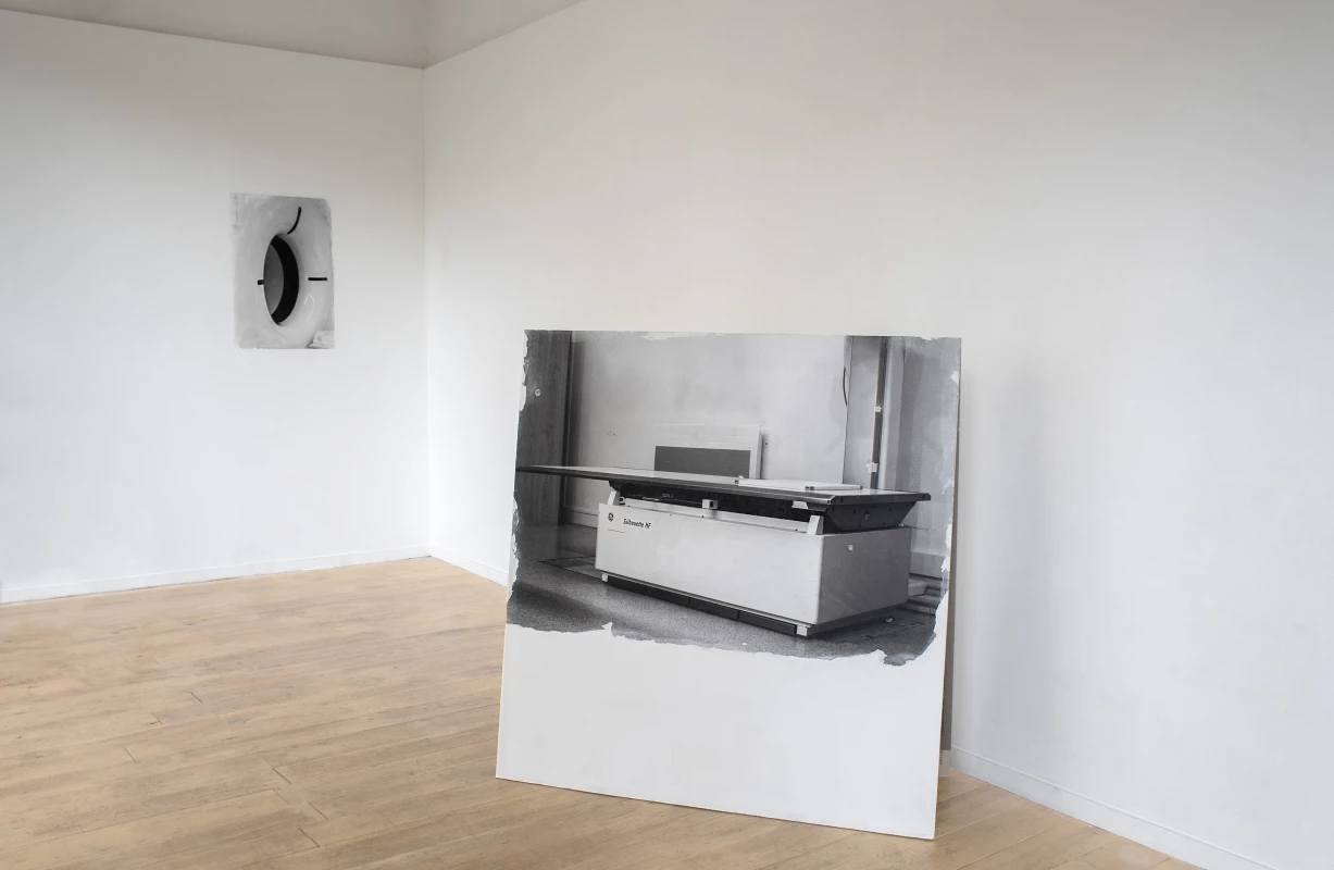 Cette exposition est née de la série Théâtre de machines d’Emma Cossée Cruz, réalisée dans des centres d’imagerie médicale de la région nantaise. Les photographies ont ensuite été transférées sur des plaques de placo plâtre par une technique qui évoque celle de la fresque. Déployées dans l’espace d’exposition telles des stèles, les feuilles de plâtre ploient. À leur surface, on peut observer les lignes, les volumes et les socles de ces machines, leur donnant forme. Entre monstres et objets curieux l’image de machines se fait organique pour s’intégrer aux murs du Centre Claude Cahun comme des fantômes hantant l’espace. « Mon projet s’inspire d’ouvrages illustrés de la Renaissance qui présentaient des gravures d’inventions techniques : le théâtres de machines. Comme dans mes photographies, la machine y est représentée frontalement, en usant de la perspective et d’un usage très construit des lignes de forces. »