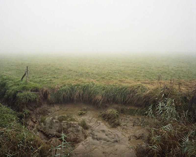 Réalisée au moyen format argentique, cette série de photographies s’attache à restituer dans toutes ses nuances un paysage dont la particularité est son caractère sauvage, fluide, mélange d’éléments filtré par une atmosphère humide où la lumière se dissémine. Pour autant, ce n’est pas l’impressionnisme, avec sa recherche d’une diffraction des formes par l’effusion des lumières et des couleurs, qui en constitue le modèle pictural. C’est bien plutôt du côté de la peinture classique, celle du XVIIème siècle franco-italien, qu’il faut se tourner pour comprendre ce qui anime ces photographies : importance de la composition et du dessin du paysage, ampleur de la vue, précision du détail non seulement des formes mais des gradations de couleurs et de lumières jusqu’aux lointains. De ce point de vue, l’oeuvre de Claude Lorrain constitue sans doute la matrice idéale de la représentation de la nature recherchée par Maitetxu Etcheverria : chez ce peintre francais qui travailla essentiellement en Italie, le sujet mythologique ou religieux n’est que le prétexte à d’infinies recherches sur la lumière et la couleur. Toute son oeuvre est fascination pour les modulation infinies de l’air et de l’eau dans la lumière. Il consacrait d’ailleurs un temps considérable à l’observation de la nature, du lever au coucher du soleil, et innovait jusqu’à préparer et mélanger ses couleurs in situ, afin de tenir compte de la qualité de l’atmosphère dans laquelle s’exerçait sa perception. C’est cette même préoccupation qui est à l’oeuvre dans les photographies de Maitetxu Etcheverria, qui s’attachent d’abord à saisir une certaine qualité d’air et de lumière (tons mordorés de fin du jour, sfumato de la brume sur le fleuve…), comme si cette matière était la substance même de toute forme, infiniment graduée du premier au dernier plan de l’image, reflétée en miroir entre le ciel et l’eau. C’est par la lumière et la spécificité de sa réfraction dans l’air que se détermine la tonalité esthétique de ces photographies et que se montre la respiration des éléments, leur bruissement et leur ondulation.