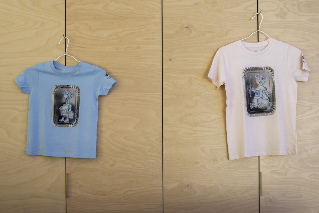 En écho à son œuvre PPE (2019), présentée dans le cadre de l’exposition Children Power (jusqu’au 19.12.21), Richard Fauguet a fait réaliser en édition limitée des T-shirts pour enfants reprenant certains des motifs de la série de dessins sur carton présentée au Plateau, qui revisite les portraits plus connus de Picasso, rigoureusement encadrés par des plateaux jetables en carton métallisé.