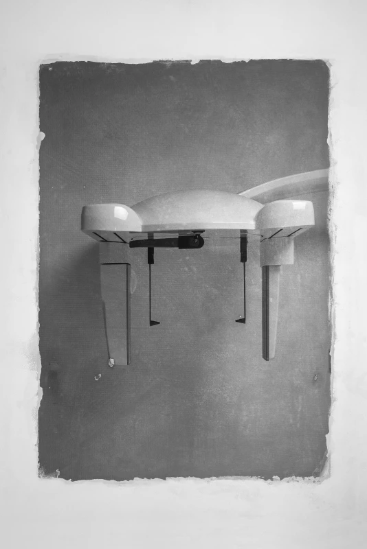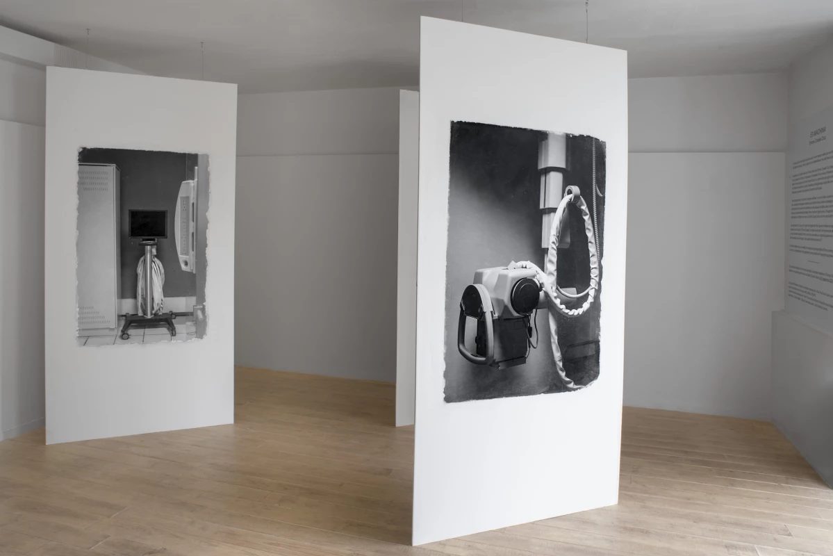 Cette exposition est née de la série Théâtre de machines d’Emma Cossée Cruz, réalisée dans des centres d’imagerie médicale de la région nantaise. Les photographies ont ensuite été transférées sur des plaques de placo plâtre par une technique qui évoque celle de la fresque. Déployées dans l’espace d’exposition telles des stèles, les feuilles de plâtre ploient. À leur surface, on peut observer les lignes, les volumes et les socles de ces machines, leur donnant forme. Entre monstres et objets curieux l’image de machines se fait organique pour s’intégrer aux murs du Centre Claude Cahun comme des fantômes hantant l’espace. « Mon projet s’inspire d’ouvrages illustrés de la Renaissance qui présentaient des gravures d’inventions techniques : le théâtres de machines. Comme dans mes photographies, la machine y est représentée frontalement, en usant de la perspective et d’un usage très construit des lignes de forces. »