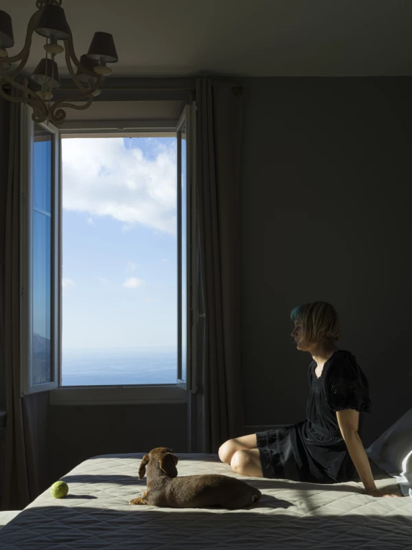 Les images d’Elina Brotherus, photographe et vidéaste finlandaise, jouent sans cesse avec les règles de ce jeu qui peut aussi s’écrire « je » et qui passe, sans se lasser, du mot au vu, du vu au poème, du poème à tout ce qui dans le cadre peut rire en silence. Elina se met en scène dans ses photographies en travaillant autant la mise en abîme que la dérision. Elle voyage ainsi avec désinvolture de l’autofiction au regard sur le paysage, de la réappropriation de l’histoire de l’art à des inventions formelles mêlant image fixes et images en mouvement. Alors oui, le travail d’Elina Brotherus racontent des histoires qui pourraient s’apparenter à des contes oubliés. La fable d’une balle rouge saisie dans son envol pour Baldessari Assignements (2016- ), celle des femmes seules de la maison Carré (2015-2018) et la comptine éternelle de l’artiste et son modèle qu’elle module à foison en sedédoublant.