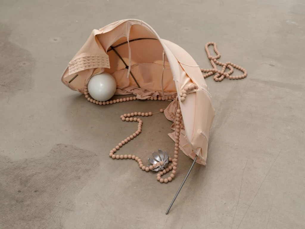 Le travail de sculptures et d’installation de Garance Früh entretient un lien fragile et ténu avec les questions de protection, de défense et de soin des corps avec l’utilisation de matériaux préexistants qui contraignent, protègent ou habillent le plus souvent les corps féminins. Ainsi, les perles, les pinces à cheveux, les crinolines, les corsets, les armatures de sous-vêtements ou les tournures, mais aussi les structures des berceaux de l’enfance ou des matériaux et ustensiles de puériculture s’infléchissent, se cintrent et se parent de divers attributs témoignant d’un sentiment paradoxal d’auto engendrement et de séduction teintée de violence sourde. La douceur laiteuse des tissus comme celle des peaux de cuir viennent contredire leur tension maximale dans l’espace ou le fait d’épouser la forme qui les guide. À la fois coquilles et nids, les sculptures de Garance Früh enfantent des formes arrondies. Leur l’érotisme se cache et se révèle tour à tour, et nous implique dans une vulnérabilité habillée et stratifiée.