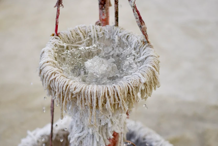 L’installation de Thomas Buswell intègre une fontaine conçue avec plusieurs haut-parleurs recouverts de serpillères plongés dans un bac rempli d’eau prolongé par des excroissances qui se propagent au sol comme des champignons mutants. Rendus inopérants, les mégaphones sans voix nous invitent à les contempler dans une forme de quiétude, telle la fontaine d’une place de village. L’eau qui circule se mêle à de longues coulées de peinture rose, jaune, verte, bleue soulevant l’idée d’une éventuelle contamination. Paradoxalement, l’écoulement de cette eau teintée de vert semble commémorer un cri collectif à l’arrêt, une révolte impuissante et contrainte par cette circulation en circuit fermé.